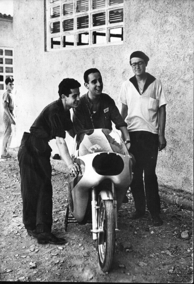 ‘Bambi’ warming up a Bultaco racing TSS with Marcel Cama at the San Adrian De Besos factory.