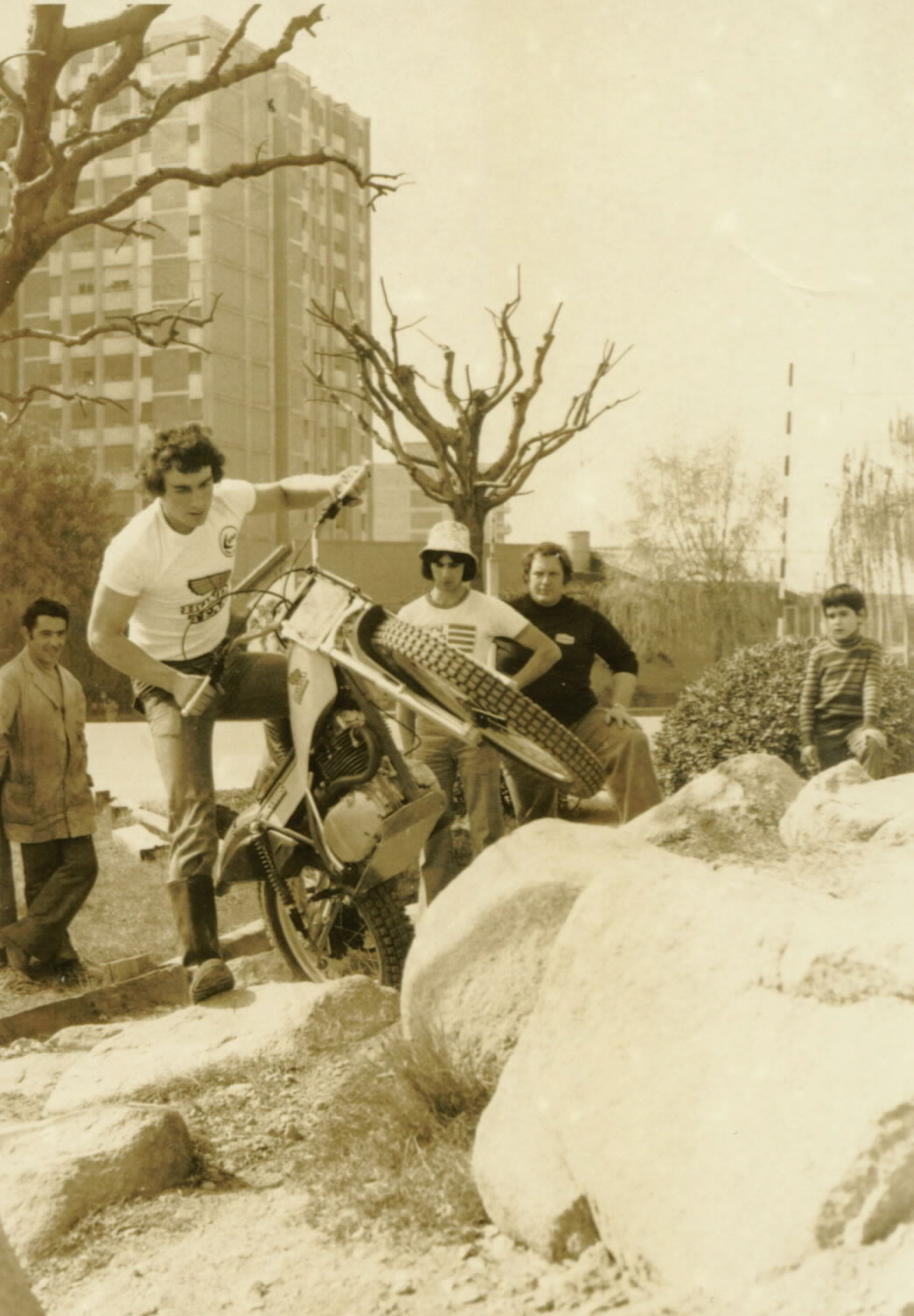 Felix Krahnstover, the multiple German Trials Champion on his 348 Cota practices over the rock garden at the front of the Montesa Espluges factory in 1977. Photo: Rob Edwards Private Collection.Watched by the Montesa factory mechanic, Nigel Birkett and Brian Fowler, Rob Shepherd puts his factory Honda through its paces outside the Montesa Factory. Now Honda owns the Montesa brand! Photo: Rob Edwards Private Collection.