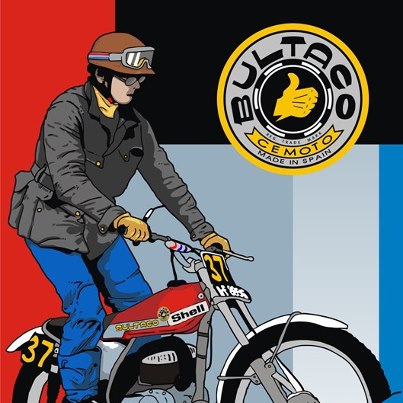 Carlos Bosch was inspired by a photograph of Manuel Soler competing in the 1974 Scottish Six Days Trial in Glen Nevis, issued with racing number 37. The photograph is the copyright of Mortons Publications, Hornchurch and therefore we are not in a position to show the image. However, an artist made a caracatuer drawing based on the photo, which Manuel used in his social media pages.