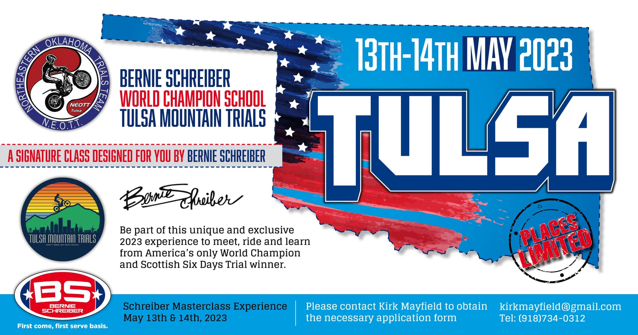 Mayfield, who is one of only six riders to have been granted life time membership in the NEOTT Said: “We have hosted many prestigious events here at our club in Tulsa, but it is such a privilege to host the USA’s only World Trials Champion and my friend for so many years here in Tulsa. Everyone is really looking forward to this, because we can share all our experiences from riding overseas and have Bernie’s instruction on how he became a world champion!”