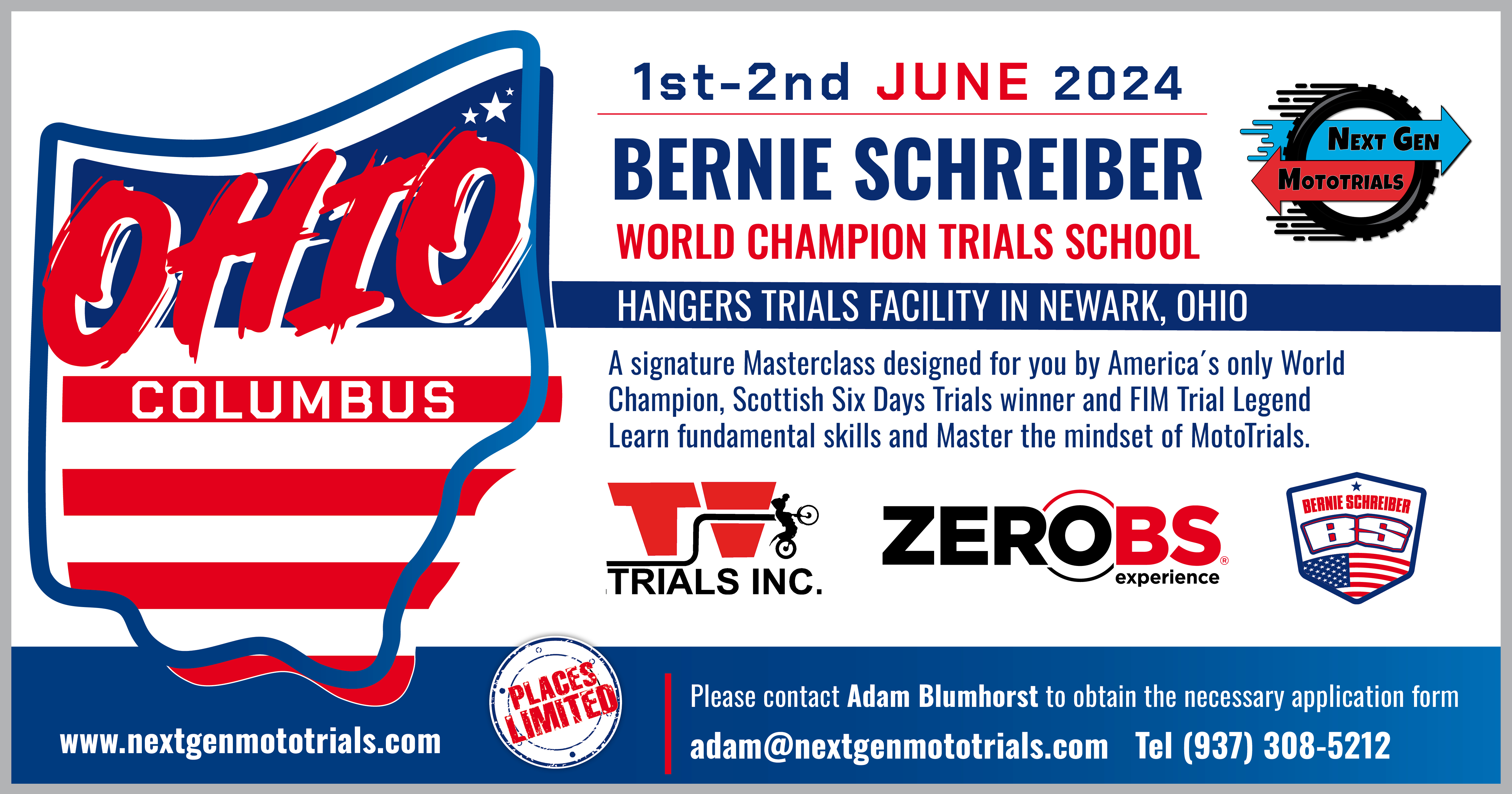 AMERICA’S only World Trials Champion and Scottish Six Days Trial winner Bernie Schreiber will return once again to the USA to conduct a two-day Masterclass on June 1st & 2nd, 2024 near Columbus, Ohio. The event will be hosted by Next Gen MotoTrials Corporation founded by Adam Blumhorst and Steph Vetterly to support, foster and secure the next generation of American youth riders.