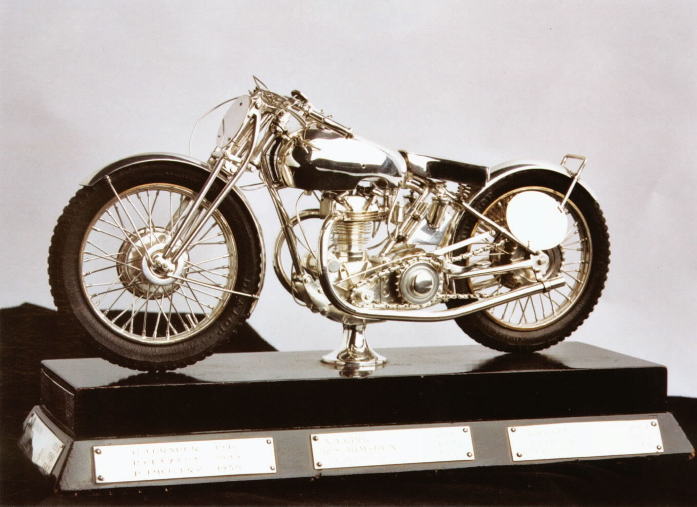 Presented to the Edinburgh & District club by the directors of Rudge Motor Cycles, the P.S. Chamberlain trophy for the Scottish Six Days was a scale model silver Rudge ‘Ulster’ four-valve head port motorcycle on a wooden plinth, which had real rubber tyres, control cables and a drive chain with individual links which worked. It was in itself a work of art.