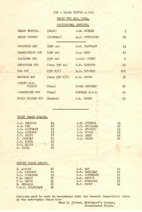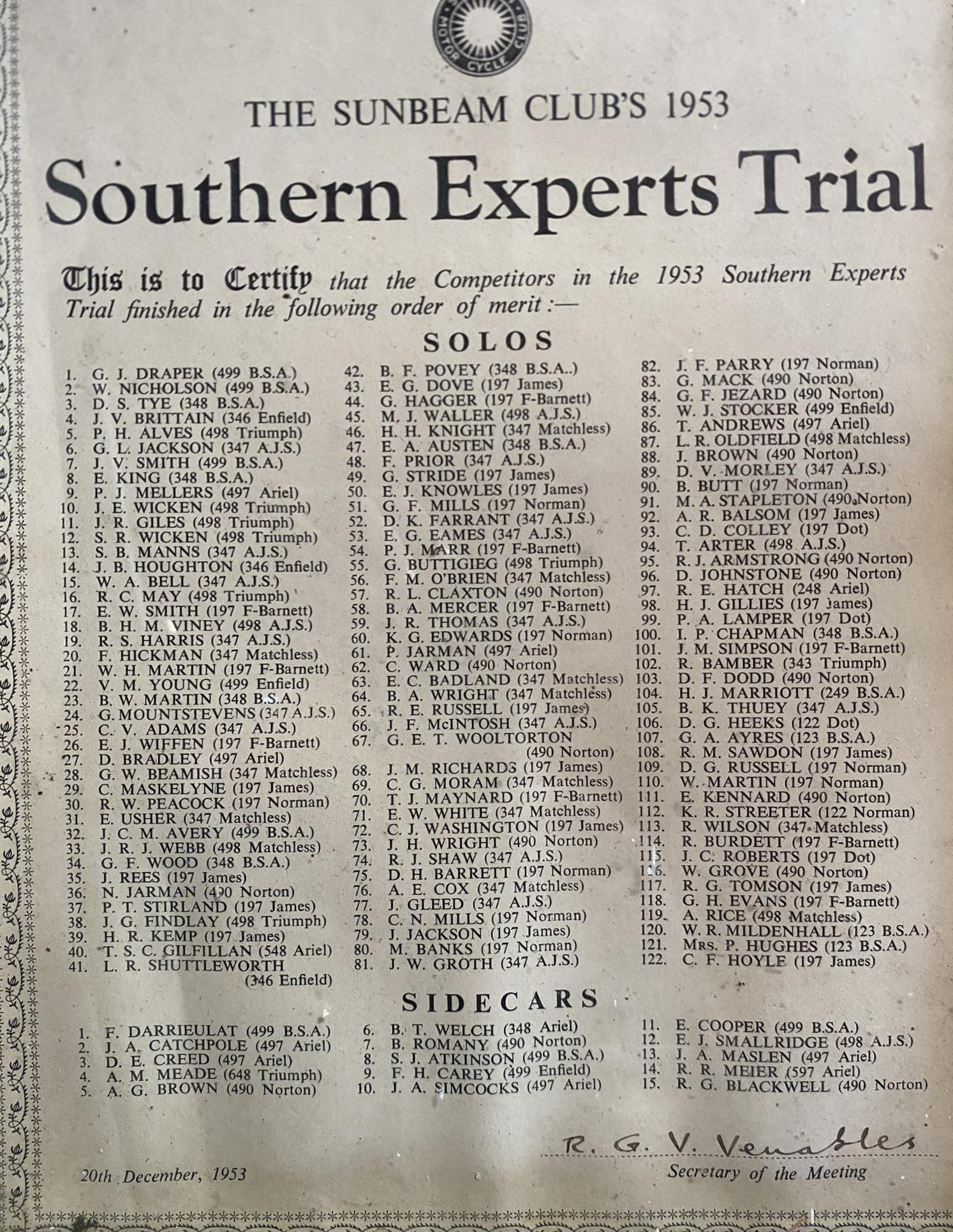 Sid managed to finish with a Special First Class award on the Norman with the loss of 55 marks. The winner was Jeff Smith on the factory BSA Gold Star who lost 20 marks.