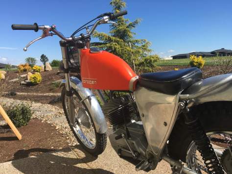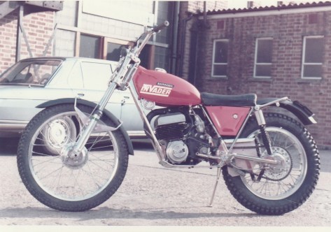 David Brand: “The finished frames, from memory a dozen or so, that were obtained at the sale were completed and sold. In the meantime, the frame jig was modified to suit the new under shield, the same as the Saracen works bikes. Simultaneously, fibreglass petrol tanks became outlawed. An alloy tank was sourced and air filter redesigned with alloy side panels. The 123cc Sachs engine lacked power, so I had the engine bored out to 199cc, Metal Profiles undertook this task. The original cylinder head was retained which resulted in high compression, this made the engine prone to stall easily. To overcome this, weight was added to the flywheel. Smaller diameter REH alloy hubs and black VF mudguards finished off the Invader model.“