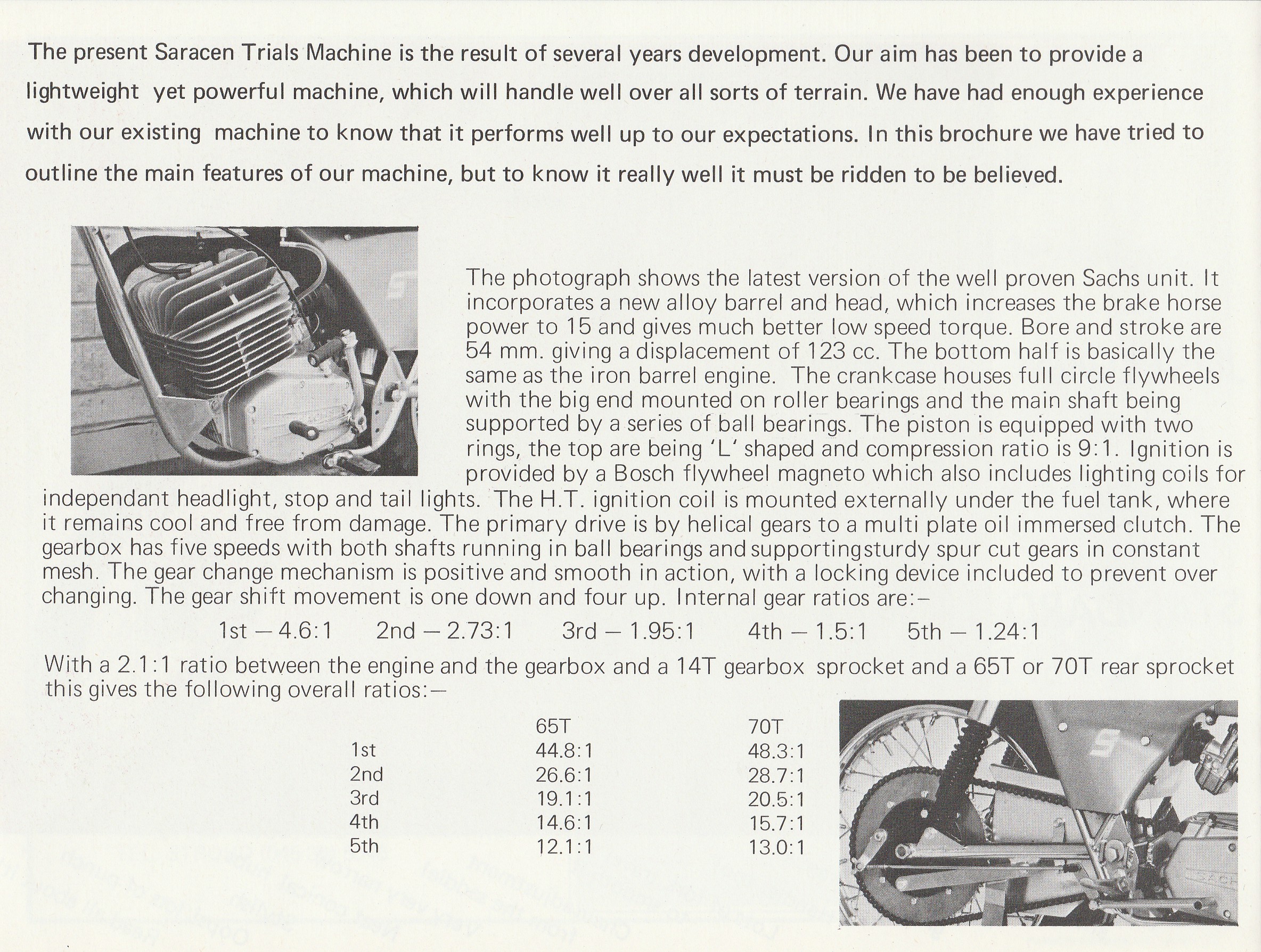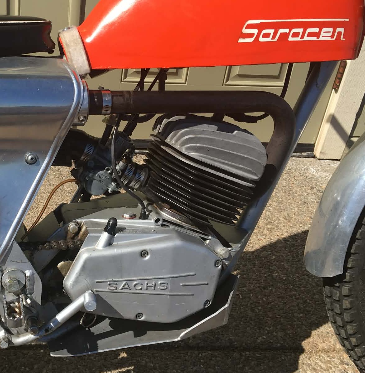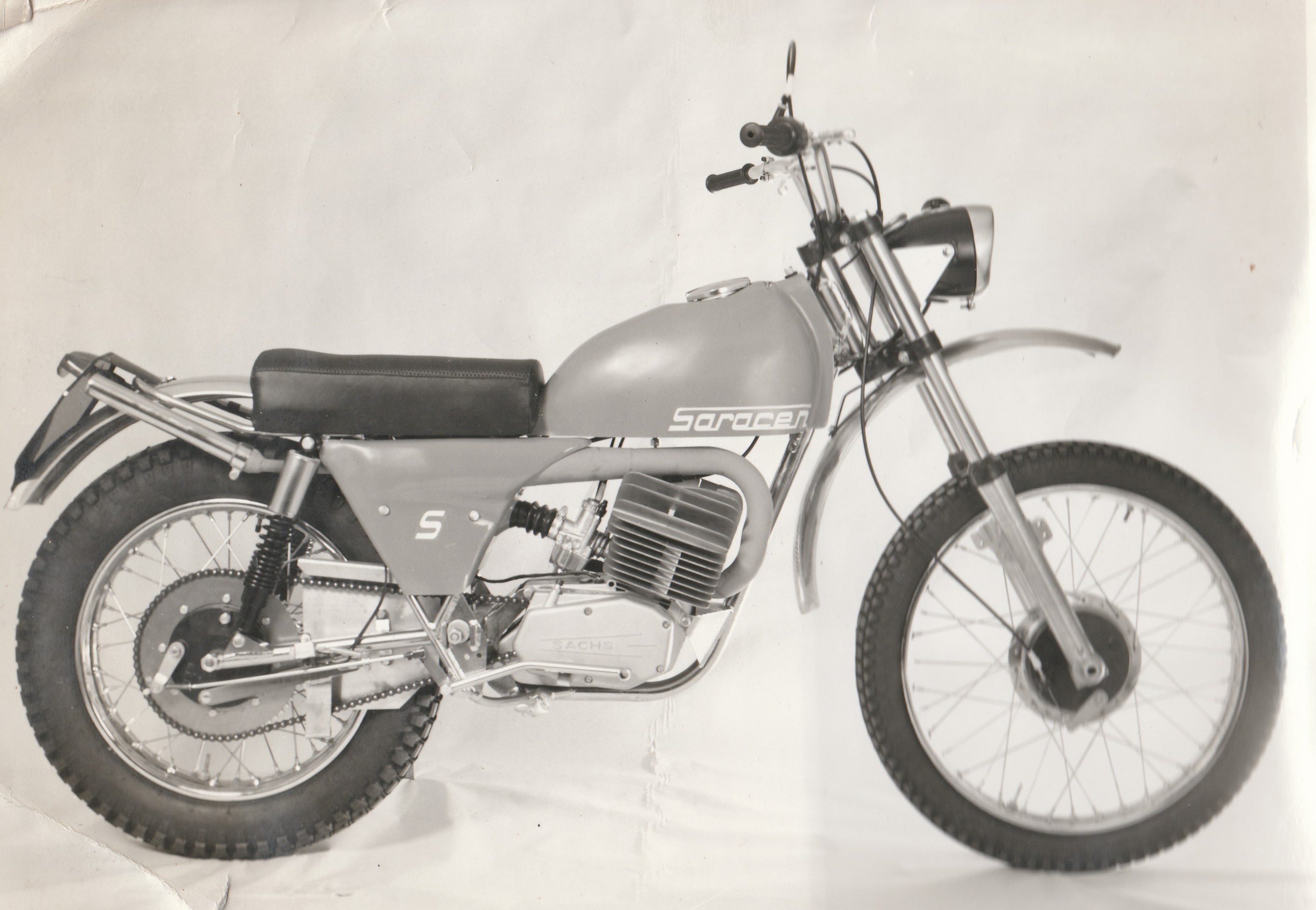 The original prototype was a BSA Bantam engined version but supply of British made engines was fraught with difficulty at this time, so Saracen opted for the German made Sachs engines, initially with the Iron barrel, but later the all aluminium engine. They also built a small number of Triumph Tiger Cub powered machines. Saracen also designed a spine framed 100cc American Hodaka engined trail bike.