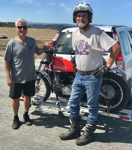 “In the movie ‘On Any Sunday’, at one hour and twelve minutes there is a brief shot of a rider on a Saracen. I was at an AHRMA event back in 2018, a gentleman came over to look at my bike. It turns out he was a factory rider for Saracen back in the day and he was the rider on the Saracen in the movie (Jeff Koskie). I’ve attached a picture of both Saracens plus a photo of the gentleman I met from On Any Sunday, he’s the one with the helmet on.” – John Hart