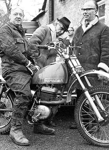 “I had a shop in Farnborough, Hampshire, trading as Len Savage Motorcycles, we were one of the first Saracen dealers in the south and I was one of the first to ride one. It was my first trials bike with the brake on the right and the gear-lever on the left, frightening! When going down a small road in Devon, a car came quite fast the other way, I went to brake, stabbed down on the gear lever instead. Those Saracens could rev!” – Derek Cranfield