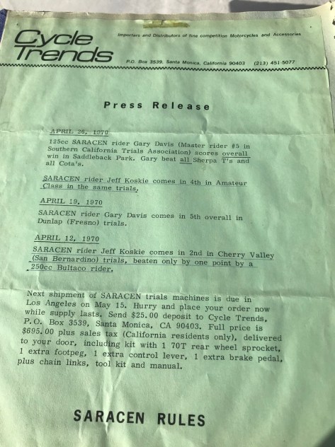 “The Saracen 125 was the first trials bike I had ever seen, It was in Los Angeles, California, Jeff Koskie had one.” – Bernie Schreiber, 1979 FIM World Trials Champion.