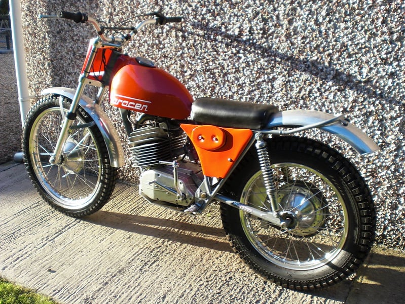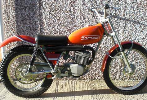 The Saracen in production form by 1971 was a smart looking trials motorcycle, the frames were single downtube, finished in Nickle plating and adorned with a bright red glassfibre fuel tank and on later versions, the matching side panels.