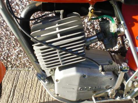 The 123,5cc engine sported a compression ration of 9:1 with an all square bore of 55mm and stroke of 55mm. The 1970 specification stated 12.5 bhp at 7,300 rpm, this increased to a claimed 18 bhp on 1971 versions. The swinging arm was initially mounted on rubber bonded bearings, later models used nylon bushings. Machines were supplied with Girling oil damped suspension units. 1970 model year machines were devoid of side panels and a mesh air cleaner looked after air filtration. Later models were fitted with side panels fabricated from glassfibre resin and sponge type filtration, accessed by a separate detachable panel. The exhaust system on early models was as a straight pipe to a ‘Peco’ style silencer, later models had a more efficient expansion chamber system fitted.