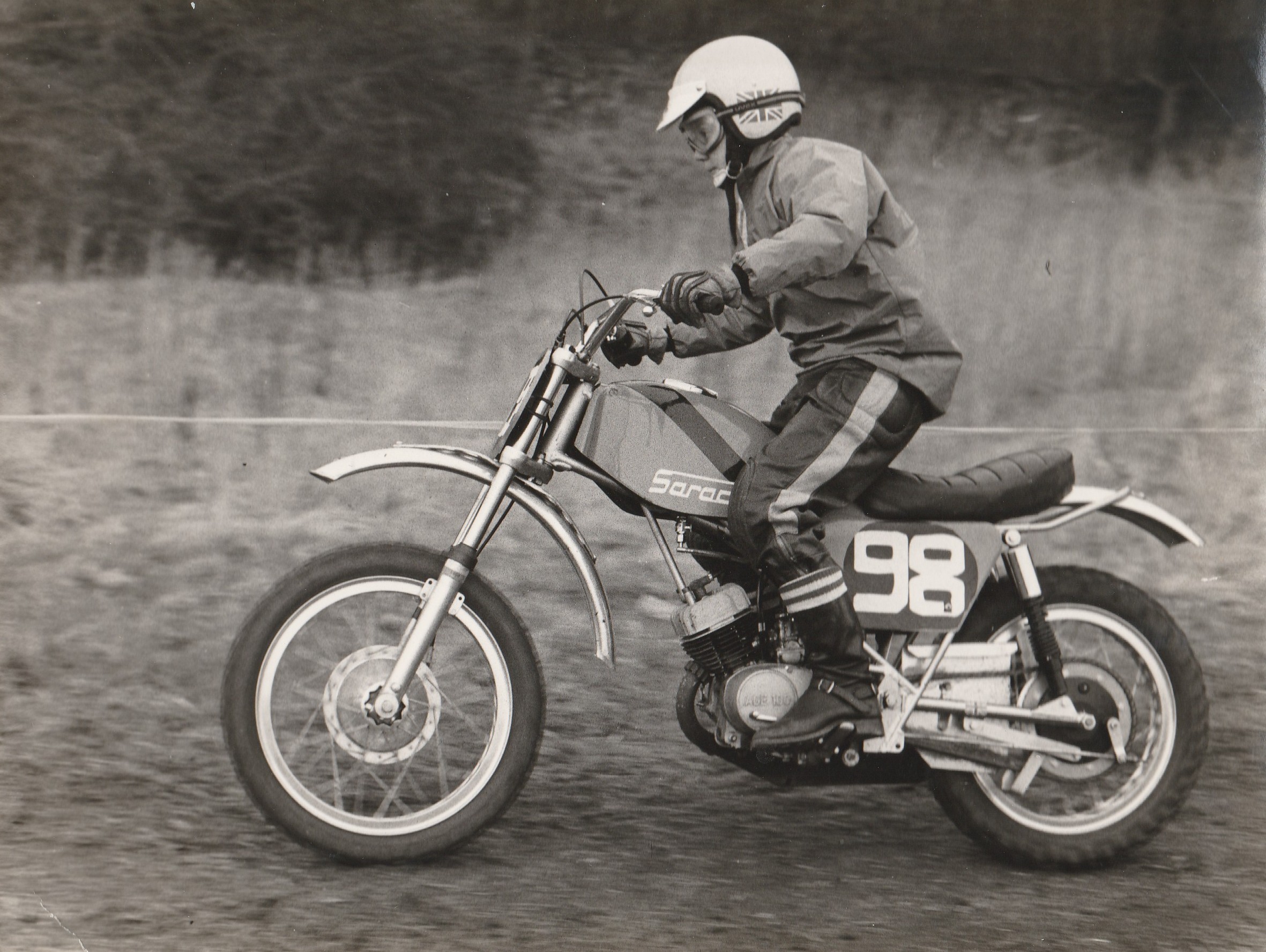 Nigel Green: “My personal affinity to the Saracen brand goes way back to my childhood. It was about 1968 when schoolboy scrambling was changing from homemade bikes being the BSA Bantams and so on to purpose built production bikes. My father was adamant I was to have a new British built bike, so he looked around and found a new local company, Saracen (Engineering) Ltd. He made contact and we were invited to Ron Goodfellow’s house in South Cerney near Cirencester, Gloucestershire, this was to try the iron barrel 125cc Sachs engined Saracen, on a disused railway line. After which it was agreed they would build a new scrambles bike for me with the all new Sachs alloy barrel engine. Production was then moved from Ron’s house to a workshop above a tyre company in Cirencester and the bikes had to come down several flights of stairs to get to ground level, from where we collected my first brand new bike, a Saracen scrambles bike at that.”