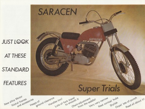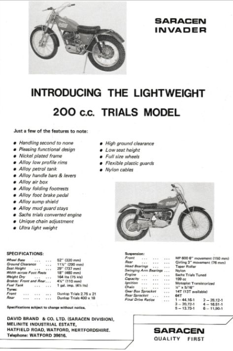 There are three stages to this story of Saracen Motorcycles, not so much a ‘beginning, middle and end’ – it is more of a first stage (Saracen Engineering Ltd), second stage (David Brand & Co Ltd) and thereafter. We bring you the story of a modestly successful small capacity trials, scrambles and enduro machine, built in England, exported overseas with some still being used as they were intended.