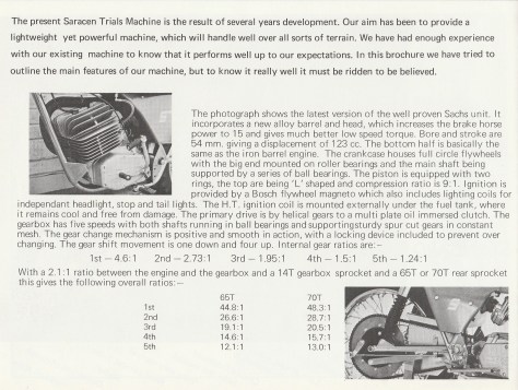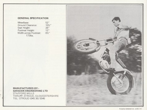 David Brand: “Various accounts of the Saracen story, written in books and magazines are not very accurate. To put the record straight, during the years 1972-1975, we had the 1974 miner’s strike and industry was only allowed to work three days a week. The pound was devalued in 1972 and interest rates had soared. Consequently, the cost of the Sachs engines was just not viable. Common sense prevailed and the Saracen trials bike ended.”