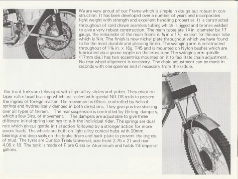 From August 1970, several improvements were made which included beefing up the swing arm spindle to 17mm with heavy duty nylon bushings, the option of both types of Sachs engine could be specified, the ‘Standard Trials’ with the iron barrel and ‘De-Luxe’ with the all-alloy unit. The fibreglass side panels were introduced and the whole chassis was now nickel plated.