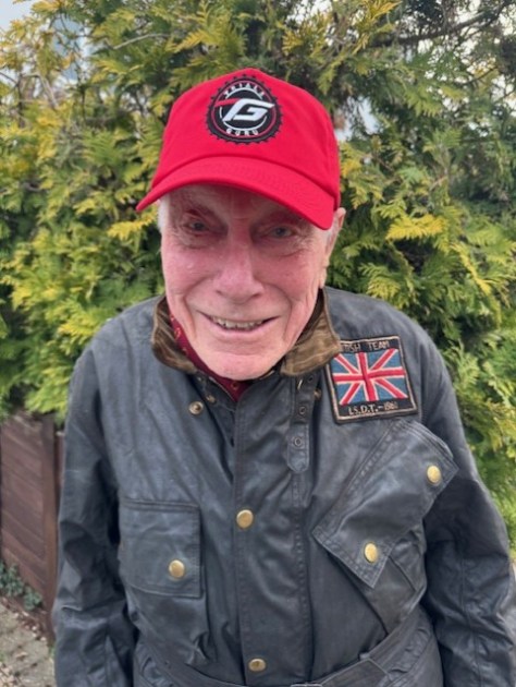 In the picture wearing the Trials Guru cap he’s wearing one of his made to measure Barbour jackets, complete with the 1961 GB team badge, proudly worn.