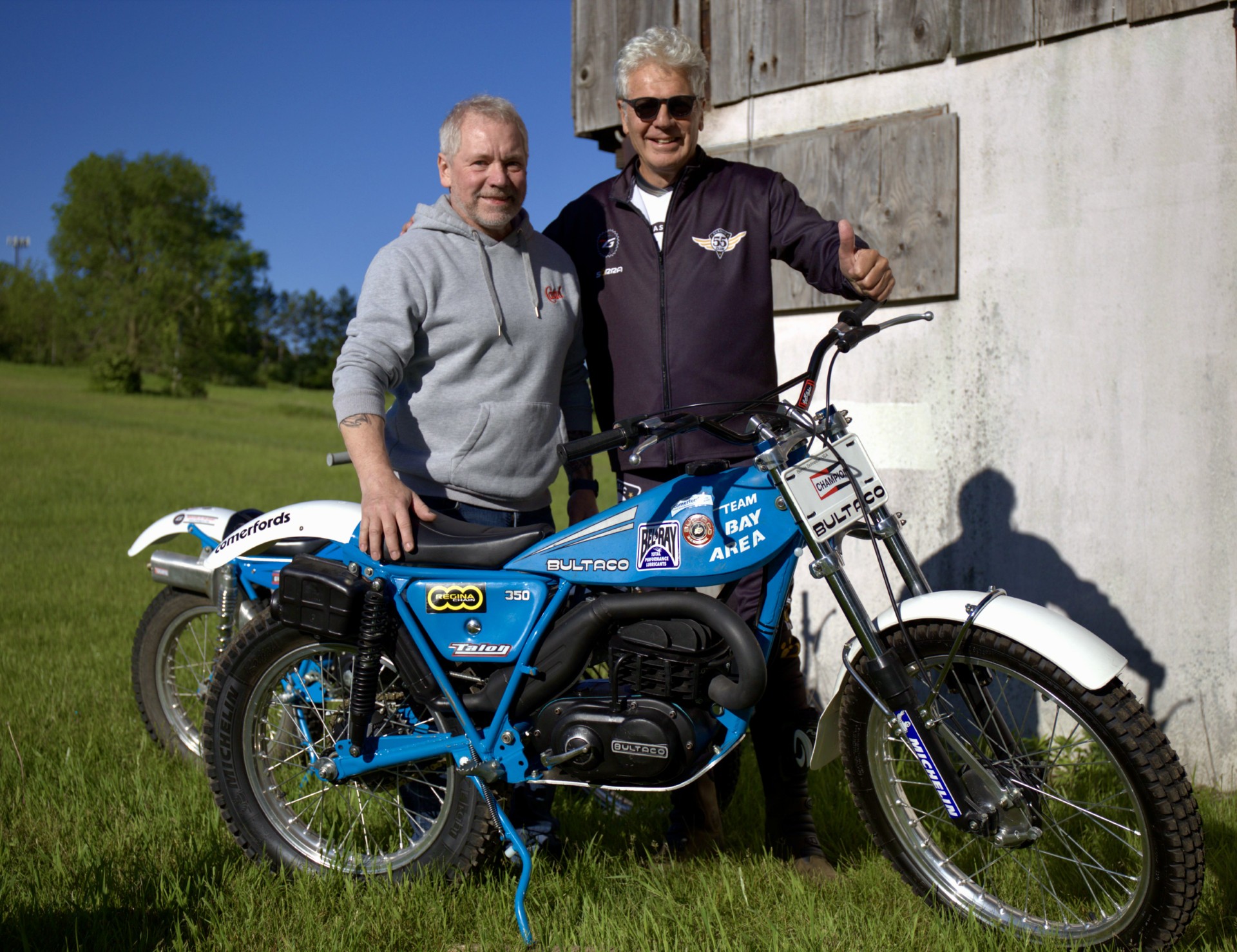 Bill Wilkinson tries one of Trials Guru’s John Moffat’s Vazquez Bultacos for size in 2015 (Photo: Jean Caillou)