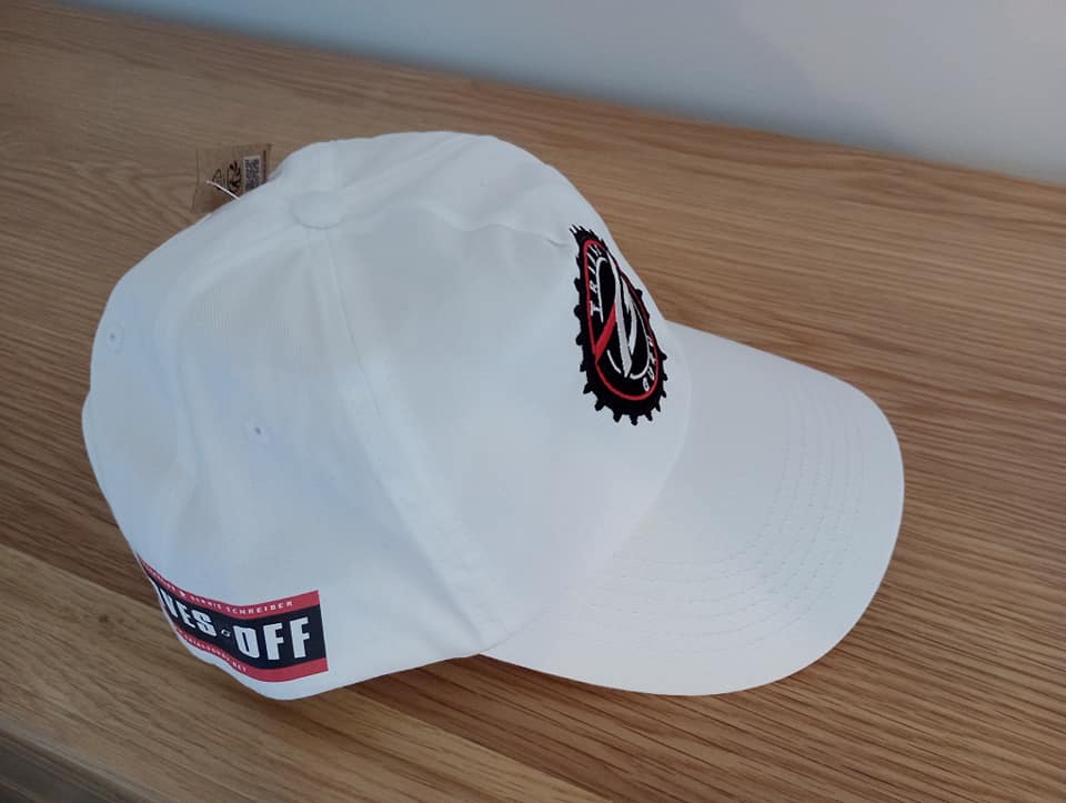 The exclusive, special edition VIP Winners cap in white. Only ten have ever been produced and presented to special recipients. Inspired by the Bell Helmets ‘Stroker’ cap a white cap with graphics in red and black.