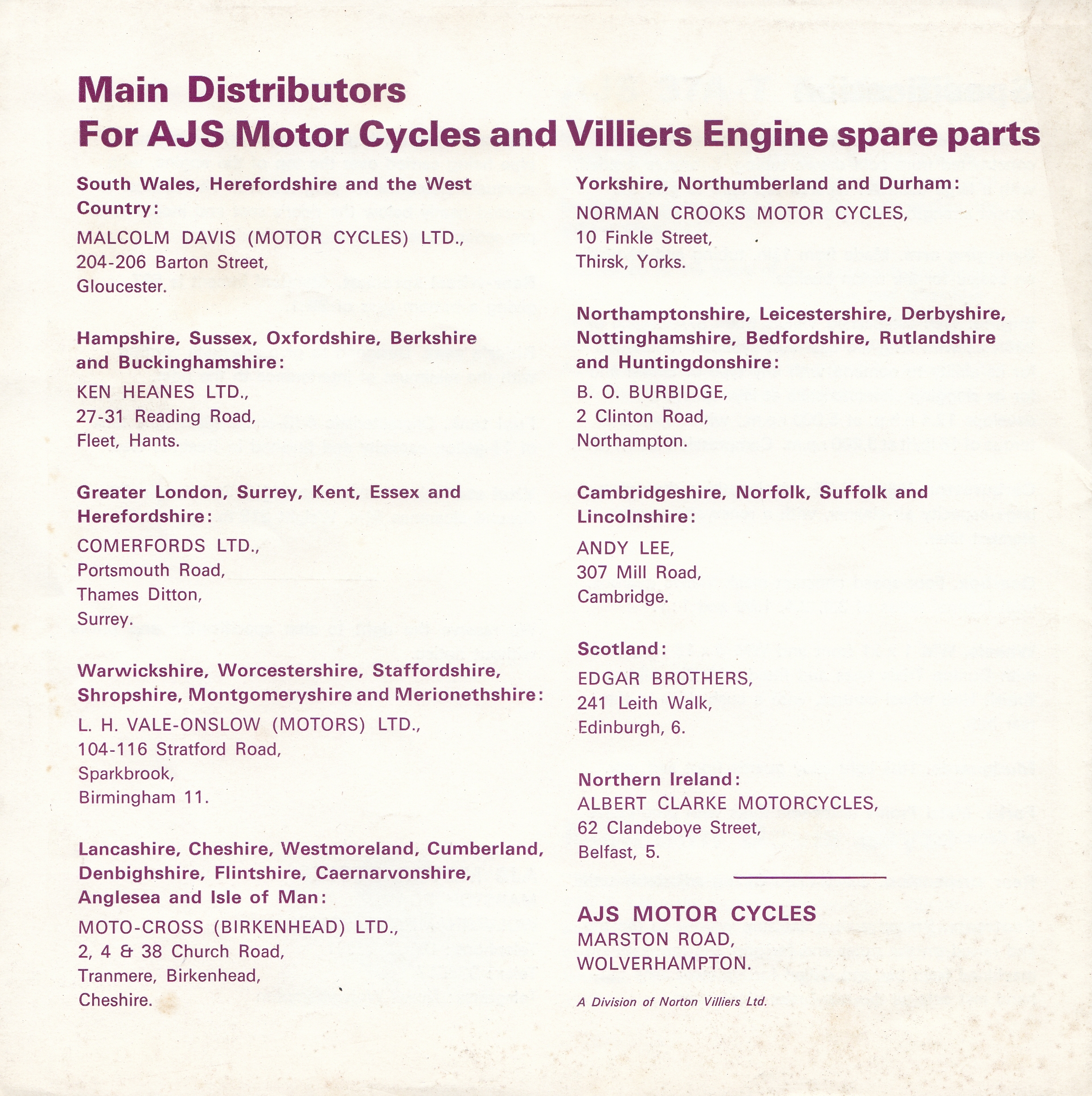 Sales through 1969 were brisk and a small network of dealers was built up which included: Allan Jefferies in Shipley; Terry Silvester in Holmfirth; Athol Motor Cycles in Pitlochry, Perthshire the Scottish Distributors; C & M Shutt in Rossendale; Ray Dell in Pudsey; John Ward Garages, Nottingham; R.G. Callow in Newport, Monmouthshire; H. Lee in Cradley Heath; Norman Crooks at Northallerton; Peter Wagstaffe of Wharfe Motorcycles in Whitchurch, Shropshire, to name but a few.