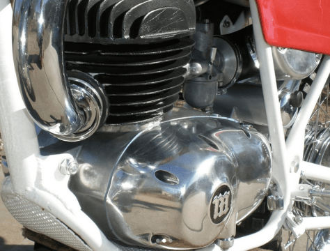 The 125cc Puch crankcases had a small slotted head drain screw located in the centre of the lower surface, so that if the engine became ‘flooded’ by overfuelling, the crankcases could be quickly drained of excess fuel with a screwdriver, to enable a clean re-start. The engine featured an engine speed clutch, mounted on the offside of the crankshaft and used helical gear primary drive, with no primary chain. Ignition was provided by a 6V Bosch AC flywheel generator. Lubrication was by 16:1 two-stroke SAE30 motor oil mixed with the petrol. When the more advanced specialised two-stroke oils became more widely available, the ratio was weakened to 25:1. The sump was heavily finned to aid heat dissipation from both the gearbox and crankcase. The Puch’s generous cylinder head finning was arranged in a sun-burst configuration to assist with heat dissipation.