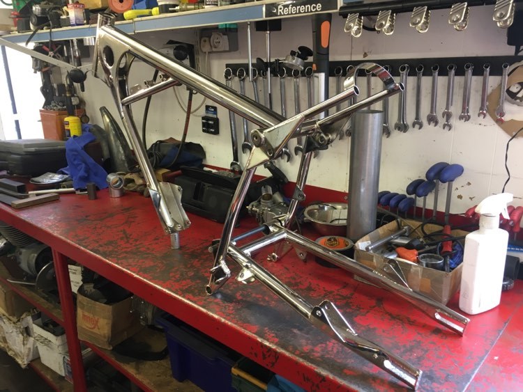 The trials model and scrambler had slightly different frame configurations, the trials version had 50.5 inches wheelbase with the scrambler two inches longer and 1.5 inches lower, which was extended later by one inch. The scrambles version had a large diameter top tube at this time.