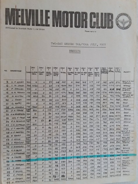 Arriving at the Blackwater group of sections, it was sunny and dry and after a quick inspection it was my turn to go. I did not get far though, after getting caught on a large boulder, the spectators were shouting and pointing at the boulder, it was covered in oil! The thin sumpguard had bent and the crankcase was holed. So no first class award that year to add to the five that I already had. I really didn’t think the bike would have lasted the week anyway.”