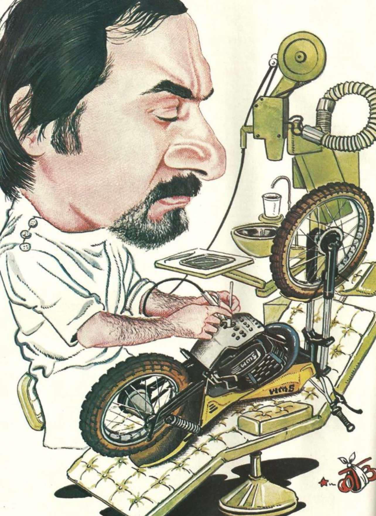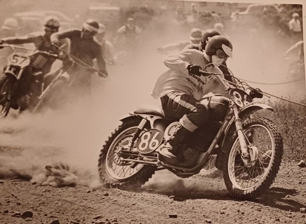 “In racing there is nothing quite like the feeling of having gone into the bend applying a bit of opposite lock pressure on the handlebars with the throttle wide open, just sitting there on the slide sometimes with your left leg up on the casing. It seems as if you could ride all day in that position. I loved it. I won the junior ‘Wimbourne Whoppa and I can tell you that riding four laps of a Grasstrack is like twelve laps of scrambling. But then I had the accident which meant I had to give it up and it changed my life.”
