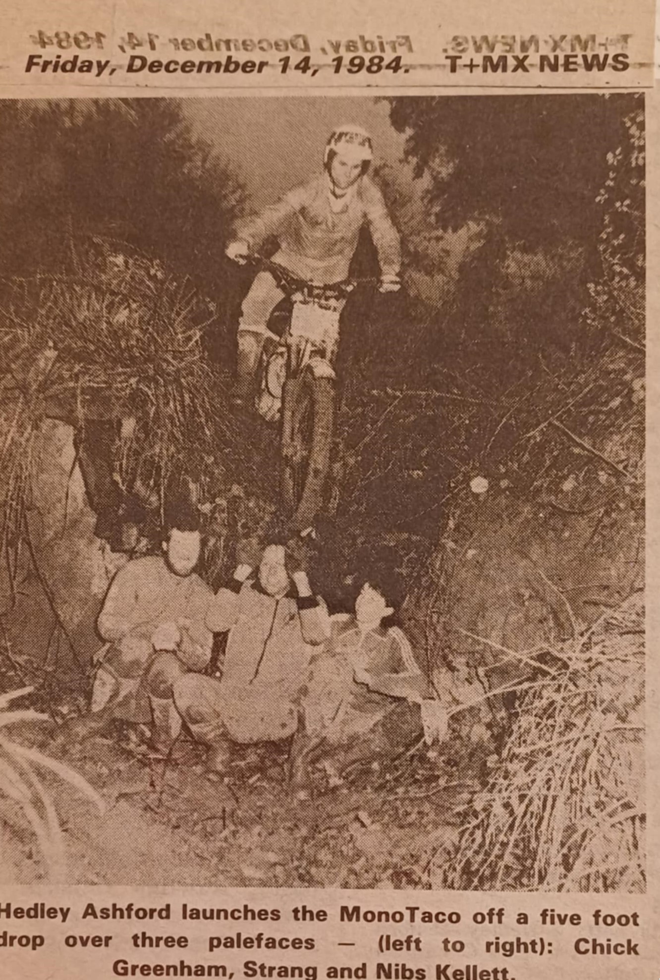 HA: “I used to ride at a place called ‘Combe Hollow’ with Martin, Geoff, Gary Marshman and a few others. One day in late 1984 this guy turned up in a pickup with a mono-shock framed Bultaco called the ‘MonoTaco’ in the back. I think his name was Pete Neale.”