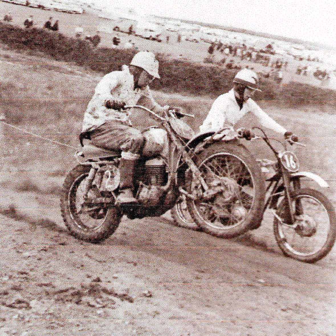 “Pat and I got married in 1954. I carried on in local scrambling riding a 250 BSA then a 500 Triumph converted speed twin. That wouldn’t half go, I had quite a bang with it at an Otter Vale scramble and it came right in half.”