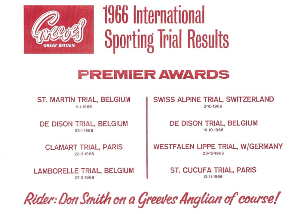 The following year 1962, Smith had a fine win at the national Hoad Trophies Trial and saw Don compete in the French St Cucufa trial near Paris, a favoured event with British riders as it was usually run on Remembrance Sunday when no events were allowed in the UK and he pulled off a fine win, now he was an international trials rider, simultaneously promoting himself and the Greeves brand to favourable effect.