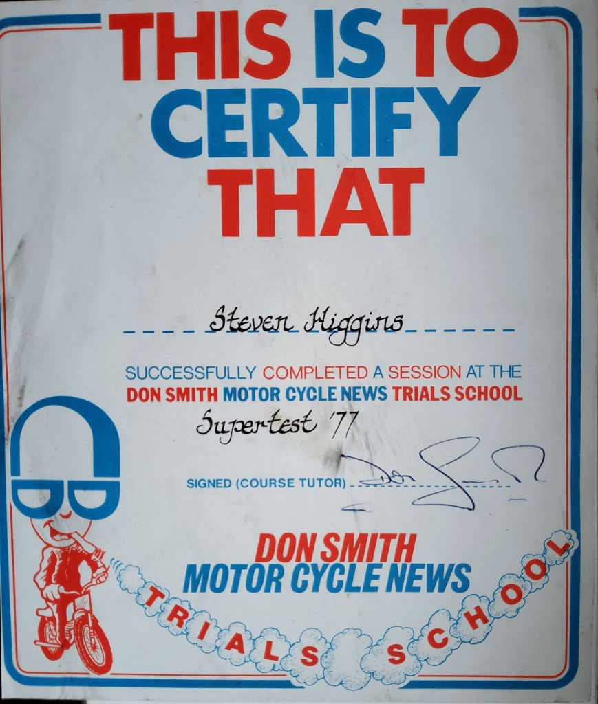 All this some forty-five years ago, so my memory is a bit distorted if not missing altogether. I think I first met him in 1977 at the Scottish Motorcycle Show held in the McLellan Galleries in Glasgow. Shortly after that we had him up to Scotland to do the first trials school north of the border. He arrived at my house in a big Ford Granada with a twin bike rack running from the rear bumper to the roof but no bike, telling me how he had raced up the road driving without shoes! He was always trying out something like this, claiming it gave him a better feel on the pedals. He rode my Honda TL250 up the wall, a trick I was never able to repeat. We ran the trials school in a quarry near Airdrie and it was well attended. At the end of the day there was a ‘passing out’ test. For the one and only time Don was beaten by a pupil, Billy Matthews from Oban. Don blamed the brake lever on my Honda TL150, which he claimed was bent. Anyway, twenty-five years later during our last conversation, he was still complaining about that defeat.“