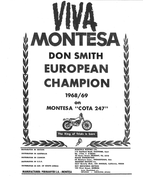Don Smith’s international riding put him in touch with contacts across Europe and at last he was contacted by the Catalan firm of Permanyer S.A., who produced the Montesa brand.