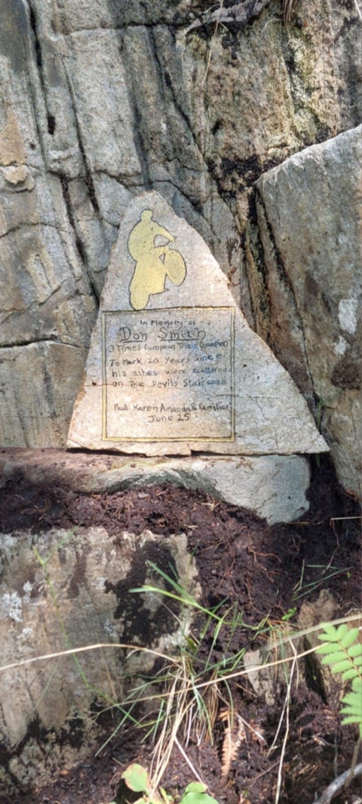 In June 2025, Don’s youngest daughter, Amanda Lazenby and her husband John, planned a trip to Scotland with a very special piece of Irish stone. They enlisted the help of Trials Guru’s John Moffat to direct them straight to the famous SSDT section ‘Devil’s Staircase’ at Kinlochmoidart. The stone had been specially painted to remember Don Smith and to be placed on the Staircase close to where his ashes were scattered in 2005. Here are the photos from that special day in June 2025, twenty years after Don’s remains were cast to a special place.