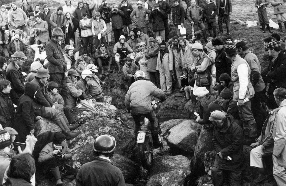 Watched by ‘Big Phil’ Paterson, Raymond Leitch from Culloden on his Bultaco, sponsored by Cawdor Castle in the 1979 White Heather Trial at Rogart – Photo: Iain Lawrie, Kinlochleven