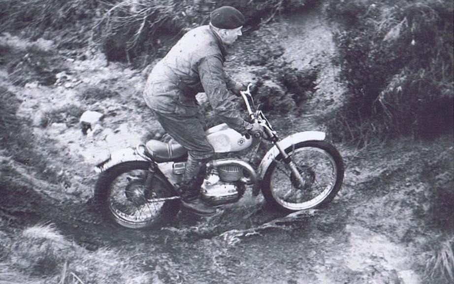 Photo above from a Leinster Club ‘Patland Cup’ trial in the 1950s. Doug Ewen on the 200cc Triumph Cub, which he really liked and on which he had done quite a lot of development work such as building a swinging arm rear suspension. It had arrived with a plunger arrangement. The Patland was one of the premier events in the Irish trials calendar. It was trade supported and attracted quite a few entries from ‘across the water’. The course was a long lap around the Sugarloaf mountain in County Wicklow and this particular section was known as the ‘Goats Pass’ in the Rocky Valley near Kilmacanogue. One of the significant things in this photo is the large number of spectators and their cars that are visible, how times have changed!