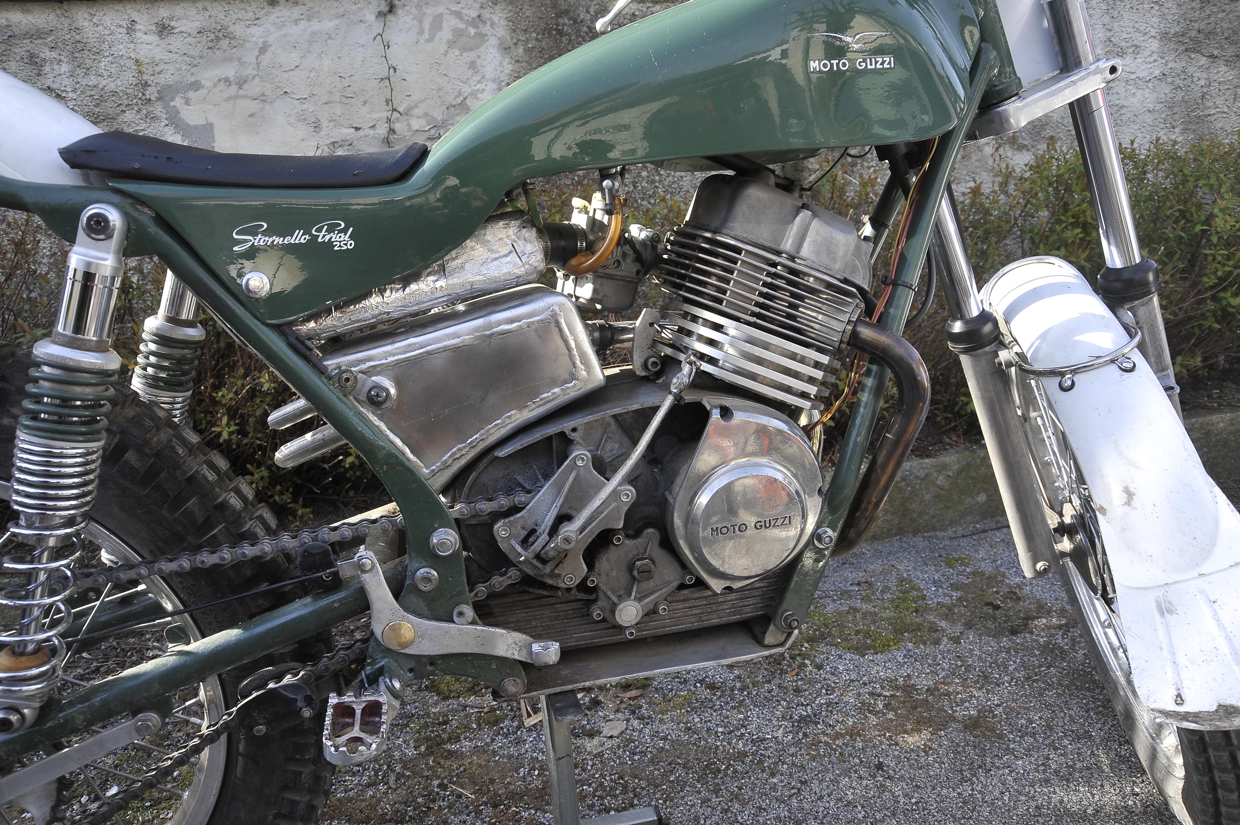 At the end of season he met old friend Carlo Colombari, ex- motocross racer and later ex-mechanic of Moto Guzzi and together they started thinking to build special motorcycle for trial competition with 4 stroke engine! They wanted to test and get an experience of that kind of bike with an engine offering lot of traction and capability of slow motion power due to characteristics of four stroke engine. For this reason their choice of an engine is Moto Guzzi ‘Stornello’.