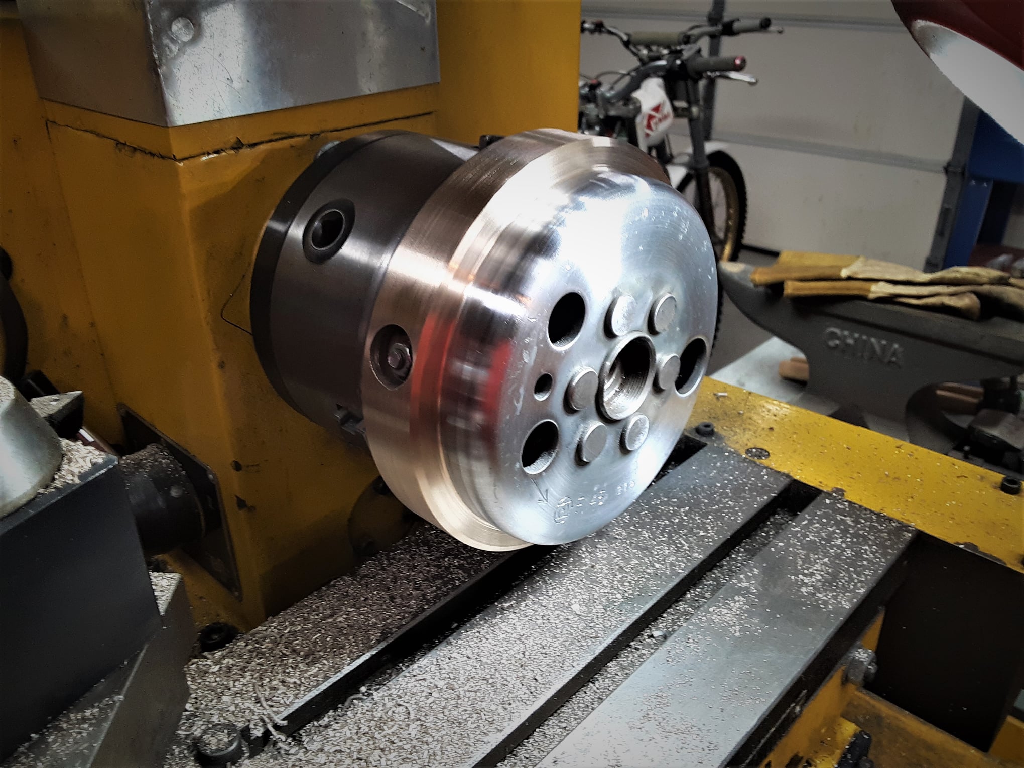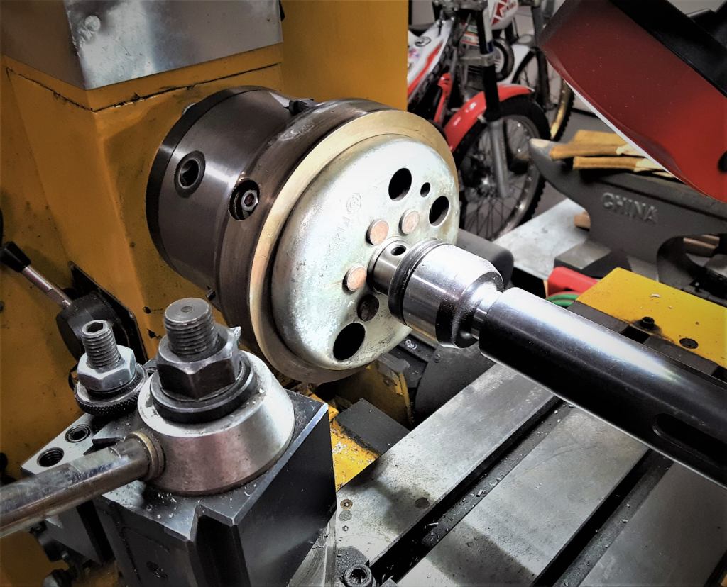 I’m going to talk on a very ‘weighty’ subject, namely Trials flywheels. This flywheel is for the 1976 Yamaha TY250 twinshock engine that will be ridden by an Expert/Master rider and I am taking off some weight to make the power delivery a little more responsive to suit his riding needs. The flywheel weight was installed by the factory a little cockeyed and the machine work will fix that.