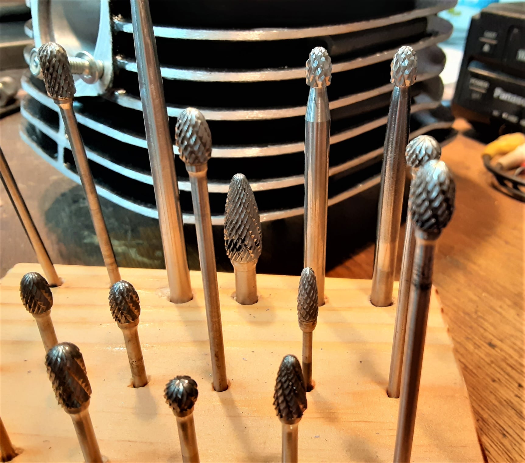 A couple of 1/8th inch carbide burrs (in the “diamond cut” pattern) for your Dremel would work and Harbor Freight Tools carries cone sander kits that will work in a 1/4″ drill. You can always FB Message me if you have questions.