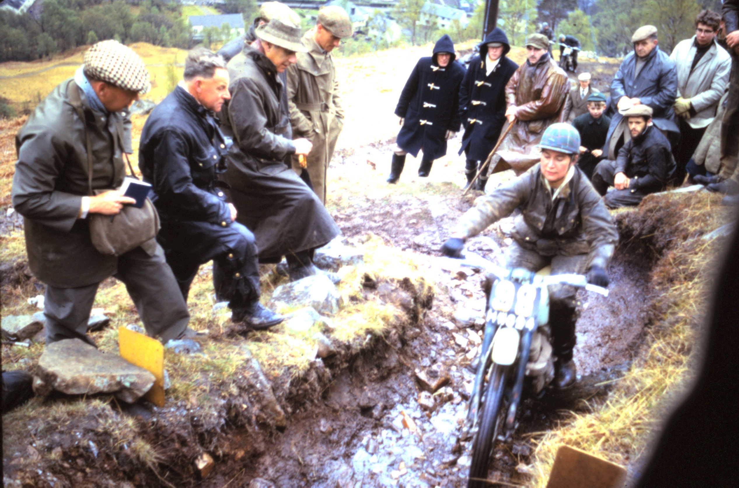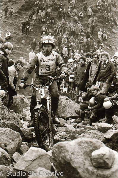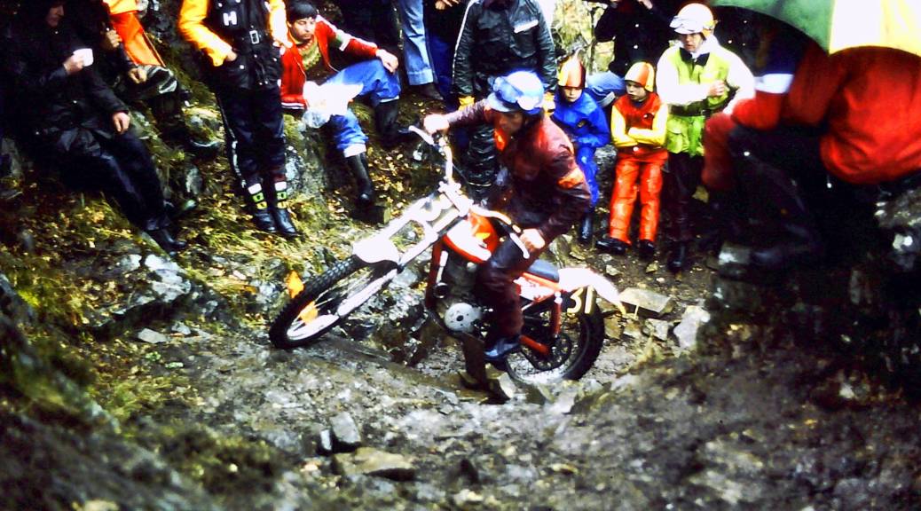 Watched by a full gallery of spectators, Jim Kelly (Honda 190) on ‘Altnafeadh’ in the 1979 Scottish Six Days – Photo: Iain Lawrie