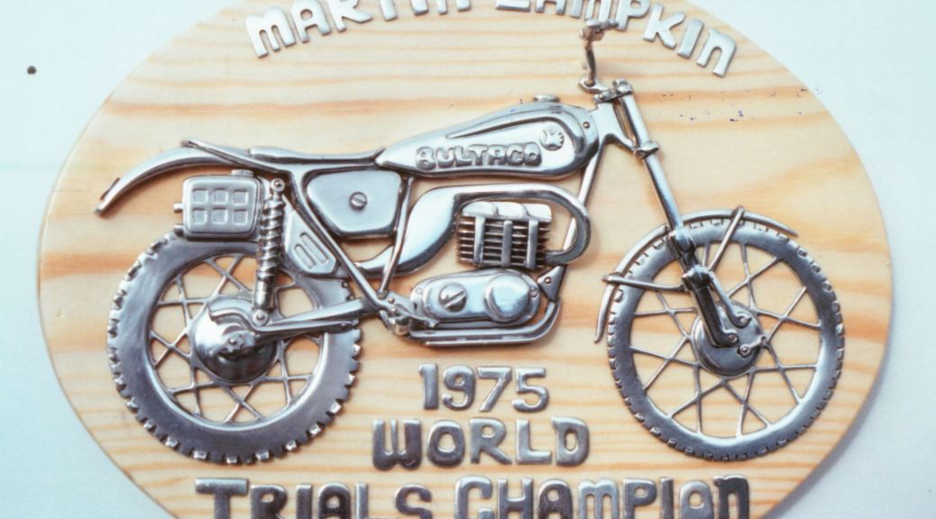 It’s a wooden plinth with an aluminium half sided model of the 1975 factory Bultaco in tribute to the late Martin Lampkin who was of course the 1975 World Trials Champion.