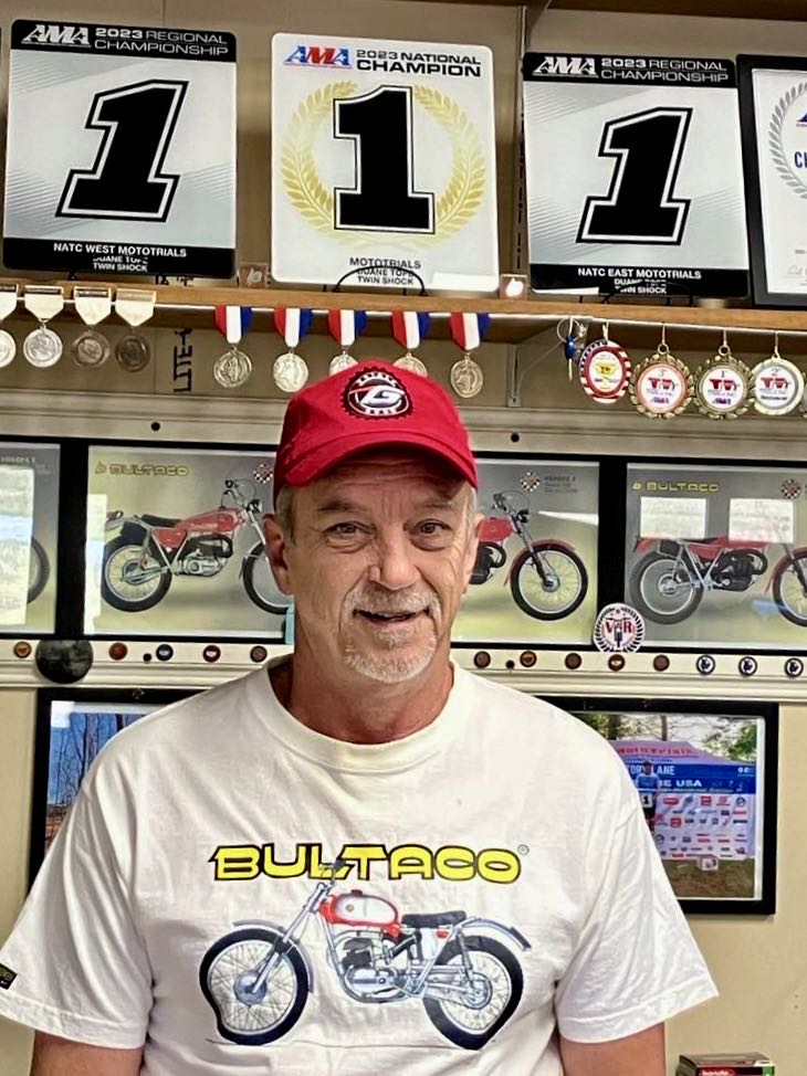 American, John Cline’s first experience seeing a trials event was in 1965. By the start of the 1966 season, he had a Honda 90 that he regeared for trials. That was the start of his passion that he still has to this day. John bought his first real trials bike in early 1969, a Bultaco model 49. Over the years he worked on everyone’s bike that road trials up until around 2010. He has always loaned out one of his bikes to people that didn’t have one at the time. Over the years John had collected around fifty trials bikes. At 90 years old he is a true Trials Guru ‘VIP’.