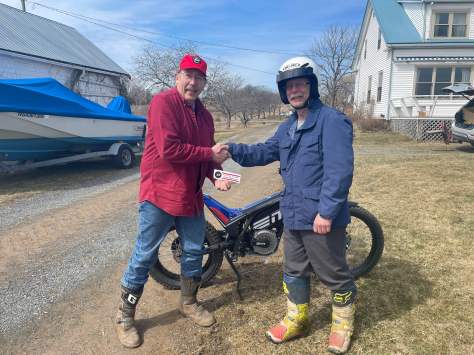 Trials Guru ‘VIP’ is Mike Traves: Although a latecomer to the world of trials, Mike has thrown himself in and continues to make his presence felt. He has been hosting and organizing trials events at the family farm for the last fifteen years or so, and has organized some top Canadian riders to come and hold one and two day trials training events. He has sought out and cleared new venues and introduced many new people to our sport. Mike was instrumental in the creation of NSORRA, a group dedicated to promote all forms of motorcycle riding in the Maritimes. he manages to get a gig at the Maritime off road show doing demonstrations, organizes the local club, sorting out dates and venues. Nationally he works with all the bodies and federations for motorcycling, and is the Canadian contact of the FIM. With FIM funding he set up the national trials initiative and produces a newsletter weekly with national and international updates, event’s training days and demonstrations. he is general manager for the Canadian TDN teams, including fund raising, travel, bike loans and finances. He works closely with the bike manufacturers and importers to promote trials. He helped get the women’s team back into the TDN event with the help of Christy Williams-Richards. Overall there is nothing he won’t do to promote our sport in the best possible light, and is always ready to help, encourage and support others. seen here being presented with his Trials Guru VIP cap and decals with his new EM, by Kevin Patterson, Canadian national intermediate runner-up 2024, himself a great ambassador of our sport.
